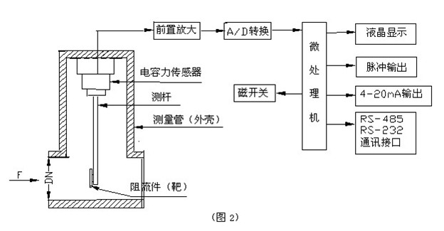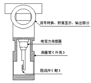 阻流件(靶)接受的作用力F,經(jīng)剛性連接的傳遞件(測(cè)桿)傳至電容力傳感器,電容力傳感器產(chǎn)生電壓信號(hào)輸出:
